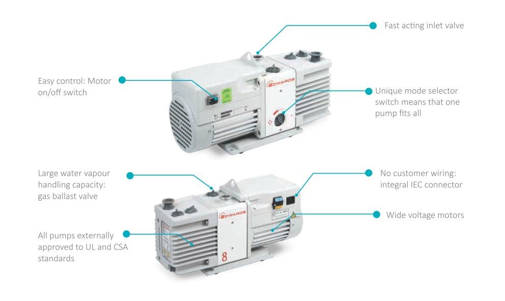 ปั๊มสุญญากาศ EDWARDS รุ่น RV Series เป็นปั๊มสุญญากาศโรตารี่ (Rotary Vane) ที่ใช้น้ำมันหล่อลื่น ให้สมรรถนะสูง เสียงเงียบ มาพร้อมระบบป้องกันการไหลย้อนอากาศ Anti-suckback เหมาะกับงานต่อเนื่องในห้องแล็บและอุตสาหกรรมที่ต้องการเครื่องปั๊มสุญญากาศที่เชื่อถือได้
