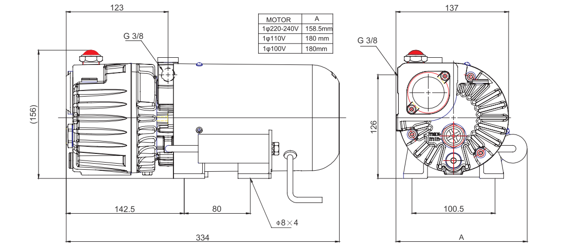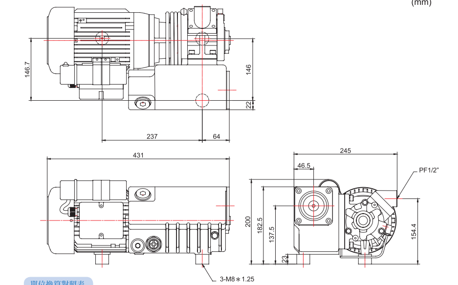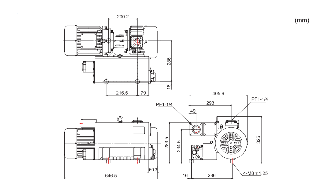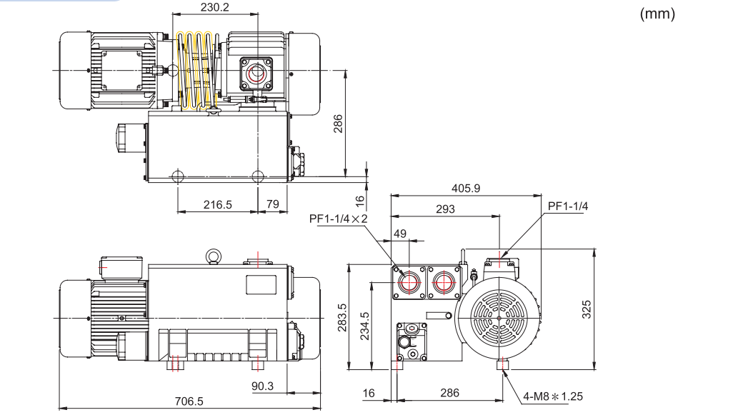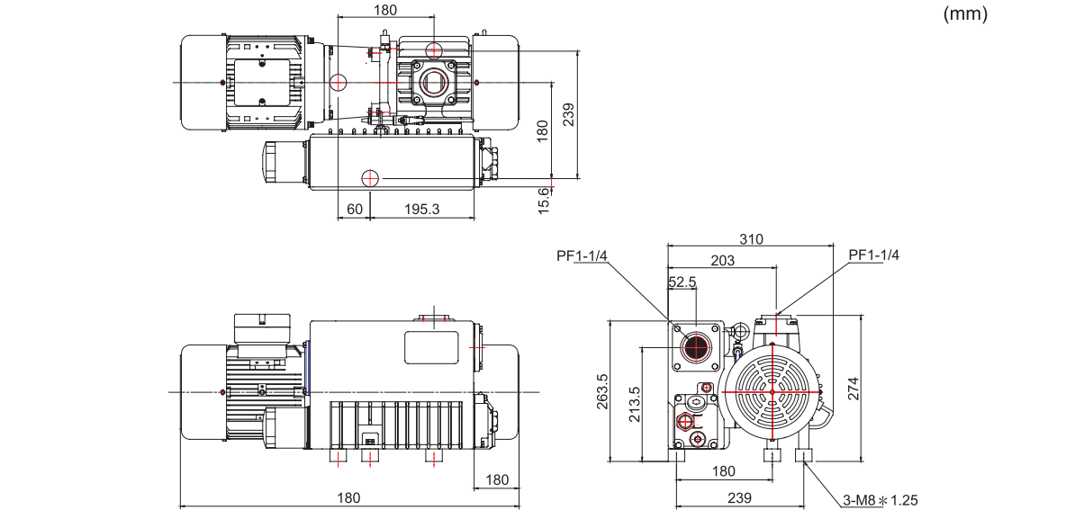 Model | Phase | Voltage | Hz | Rated Output kw | Rated Current Amps | Ultimate Pressure mabr(*¹) | Max. Pump Speed m³/h | Noise Level dB(A) (*2) | Oil Capacity L | Weight kg |
