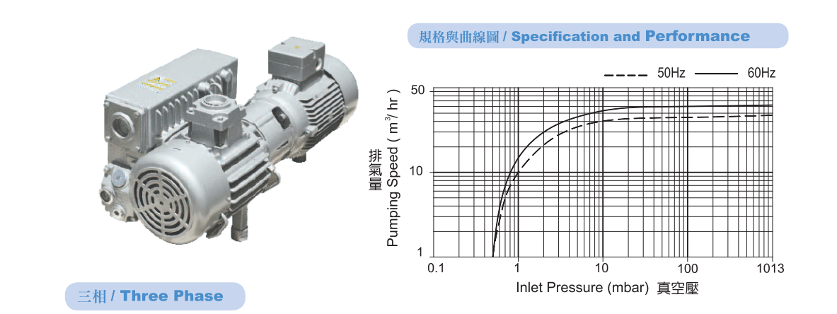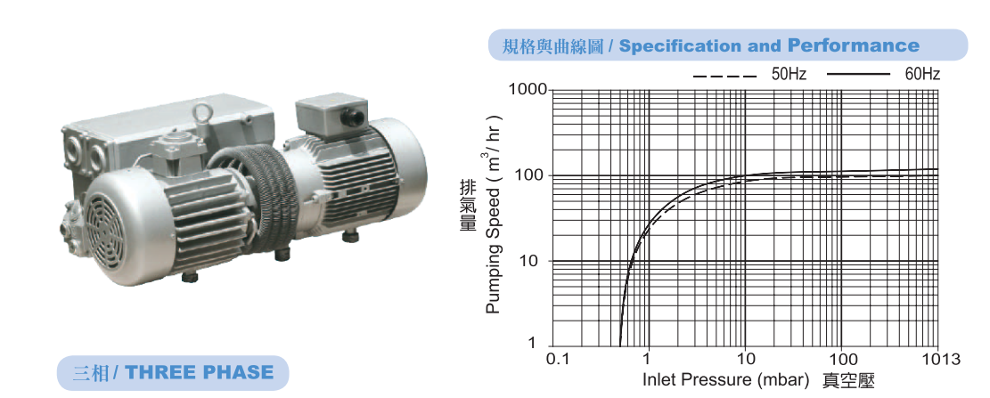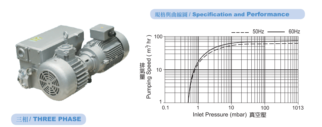 Model | Phase | Voltage | Hz | Rated Output kw | Rated Current Amps | Ultimate Pressure mabr(*1) | Max. Pump Speed m³/h | Noise Level dB(A) (*2) | Oil Capacity L | Weight kg |