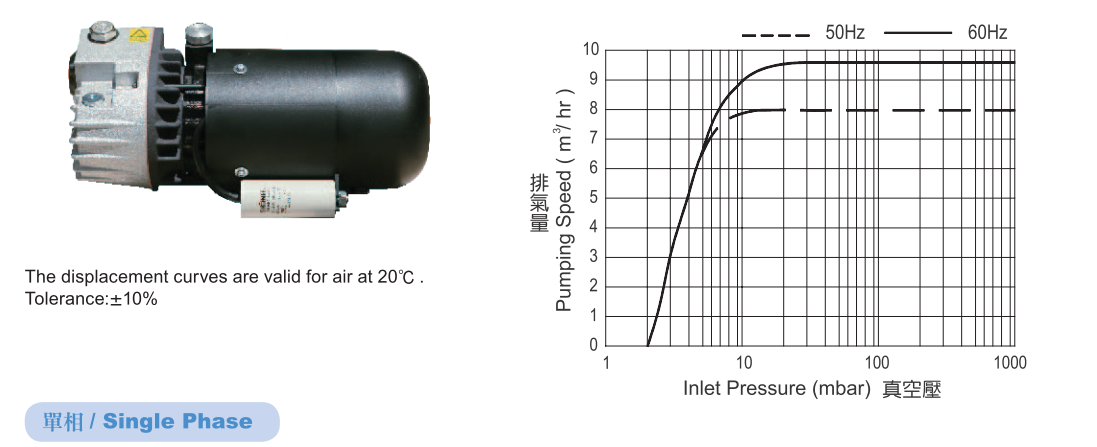Model | Phase | Voltage | Hz | Rated Output kw | Rated Current Amps | Ultimate Pressure mabr(1) | Max. Pump Speed m³/h | Noise Level dB(A) (*2) | Oil Capacity L | Weight kg |