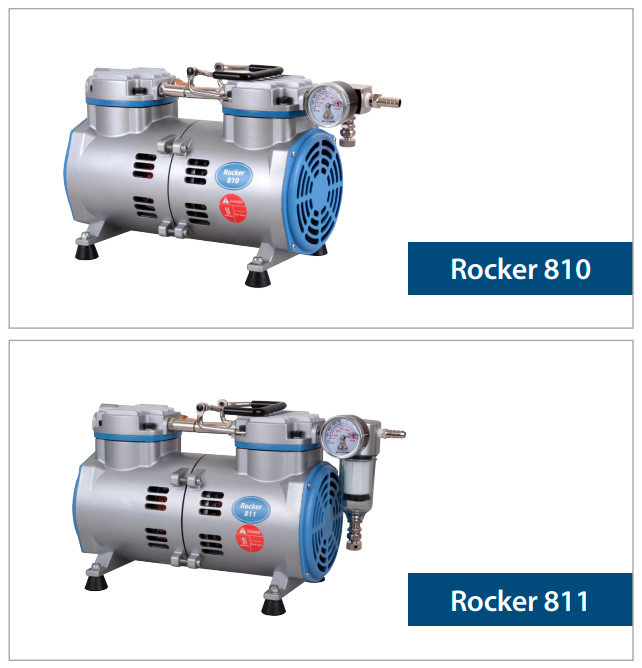ปั๊มสุญญากาศ Rocker 810 และ 811 เป็นปั๊มไม่ใช้น้ำมัน (Oil-Free) ขนาดกลางสำหรับงานห้องปฏิบัติการ แรงดูดสูง เสียงเงียบ พร้อมอุปกรณ์ป้องกันความร้อนและอายุการใช้งานยาวนาน